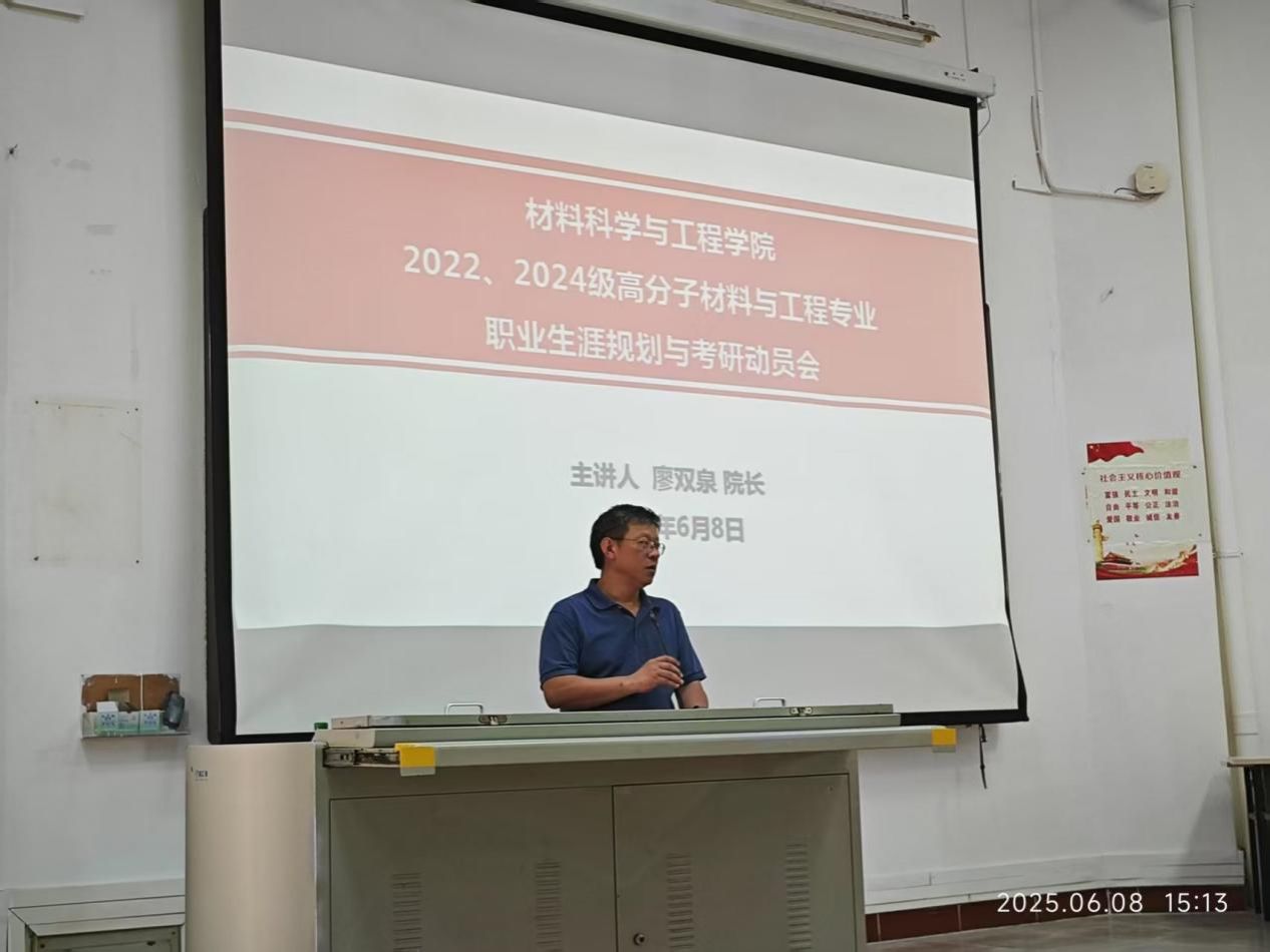 2025年6月8日下午,黑料 在2教108教室举办面向2022、2024级高分子材料与工程专业同学的职业生涯规划与考研动员活动。本次活动由高分子材料科学与工程专业责任教授廖双泉教授主讲,2024级高分子材料与工程专业全体同学及班主任、2022级高分子材料与工程专业同学参与,由兼职辅导员刘纪泽老师主持。