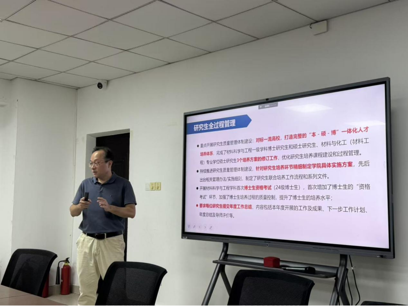 林仕伟副院长以“立德树人,协同创新,实现导师能力和研究生培养质量双提升”为主题作了培训报告。要求导师要学为人师,行为世范,做学生成长的引路人,介绍了材料学科的基本情况和研究生培养全过程及质量管控体系等方面的内容,为研究生导师提供了一场内容丰富、指导性强的学习交流会。他指出“学为人师”要求导师们不断提升自身学术水平和道德修养,以深厚的学识魅力和人格魅力感染学生;“行为世范”则要求导师恪守学术规范,以身作则,为学生树立标杆。导师应努力成为“大先生”,做学生为学、为事、为人的示范,真正成为学生科研道路上的“引路人”和人生旅程中的“灯塔”。此外,还通过详实的数据和图表,全面展示了黑料 研究生的规模结构、学科布局以及研究生培养全过程的规范管理。当前黑料 研究生队伍规模稳步增长,生源质量持续优化,毕业就业率不断提高,这对导师的指导能力提出了更高要求。