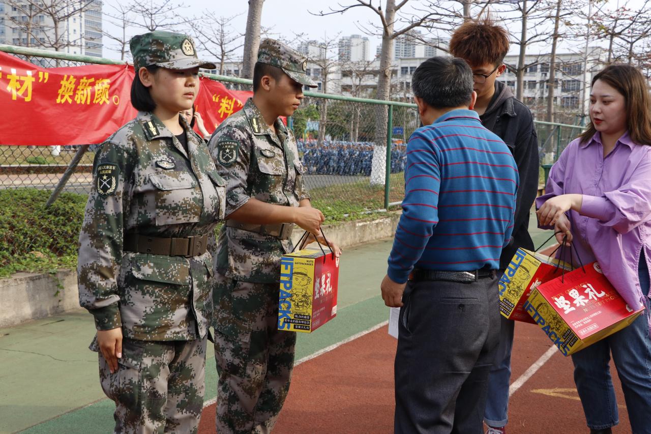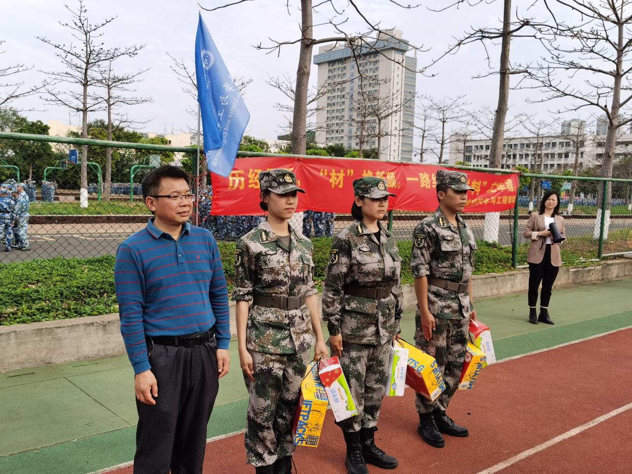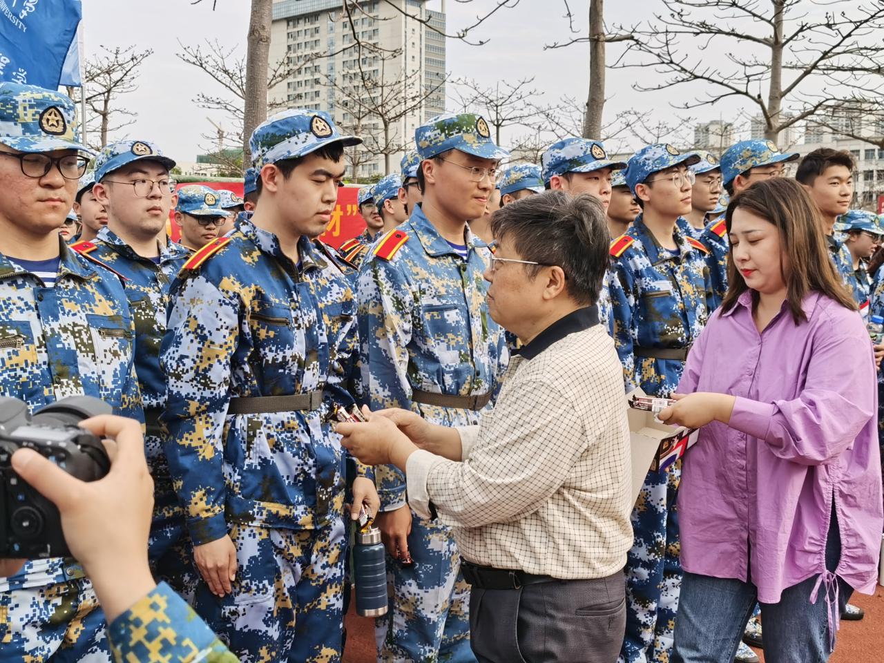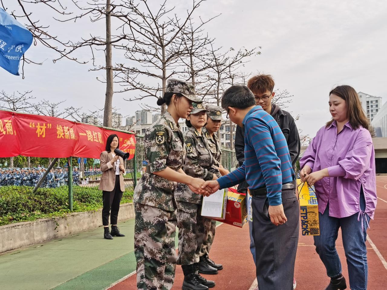 胡先文书记代表学院向军训教官送上慰问物资并表达了对十三中队教官的高度肯定和赞扬,希望三位教官在后续的军训中,高标准、严要求,训出水平、训出风采。