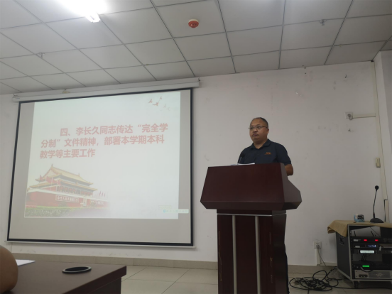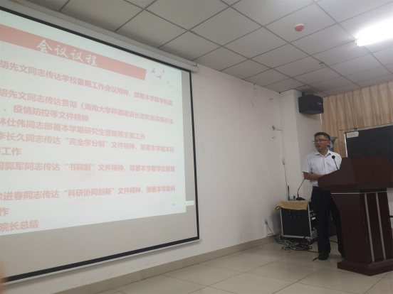 胡先文同志传达学校暑期工作会议精神,部署本学期学院重点工作。8月27日至29日,学校召开2021年暑期工作会议,会议主题是:高举习近平新时代中国特色社会主义思想伟大旗帜,解放思想、敢闯敢试、大胆创新,坚持高质量发展、全面提升办学水平,创建与海南自由贸易港发展相适应的一流大学。会议学习了校党委符宣国书记的讲话、骆清铭校长的主题报告,传达了完全学分制、书院制和协同创新中心等文件精神。