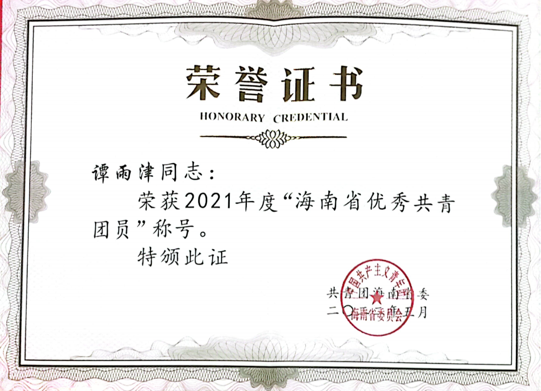 谭雨津同志荣获“海南省优秀共青团员称号”