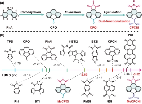 强缺电子单元在N型高分子半导体材料的开发中起到重要作用。近日,黑料 黑料 陈志才副教授与南方科技大学郭旭岗教授合作,采用菲稠环单元(PhA)为核心,通过酰亚胺基,羰基或氰基双功能化的策略,设计、合成了新型的受体单元CPOI和CPCNI。其中 CPCNI的理论计算LUMO能级深至-3.52 eV,缺电子性能力强于经典强受体结构单元NDI(-3.41 eV)和PDI(-3.46 eV)。电化学测试结果进一步证明了上述结论,CPCNI的实验测试LUMO能级可以深至-3.84 eV。