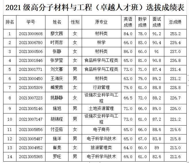 根据黑料 《关于做好 2021 级普通本科特色班级选拔工作的通知》(海大教[2022]5号)和《关于开展 2021 级特色班级招生选拔二次志愿征集工作的通知》(海大教[2022]19号)文件精神,由学生本人自愿报名,经过英语、数学考试和面试等环节,在政治思想、身体状况满足条件的前提下,按英语+数学+面试的总成绩由高到低排序,择优录取14名同学,组建2021级高分子材料与工程卓越人才班。