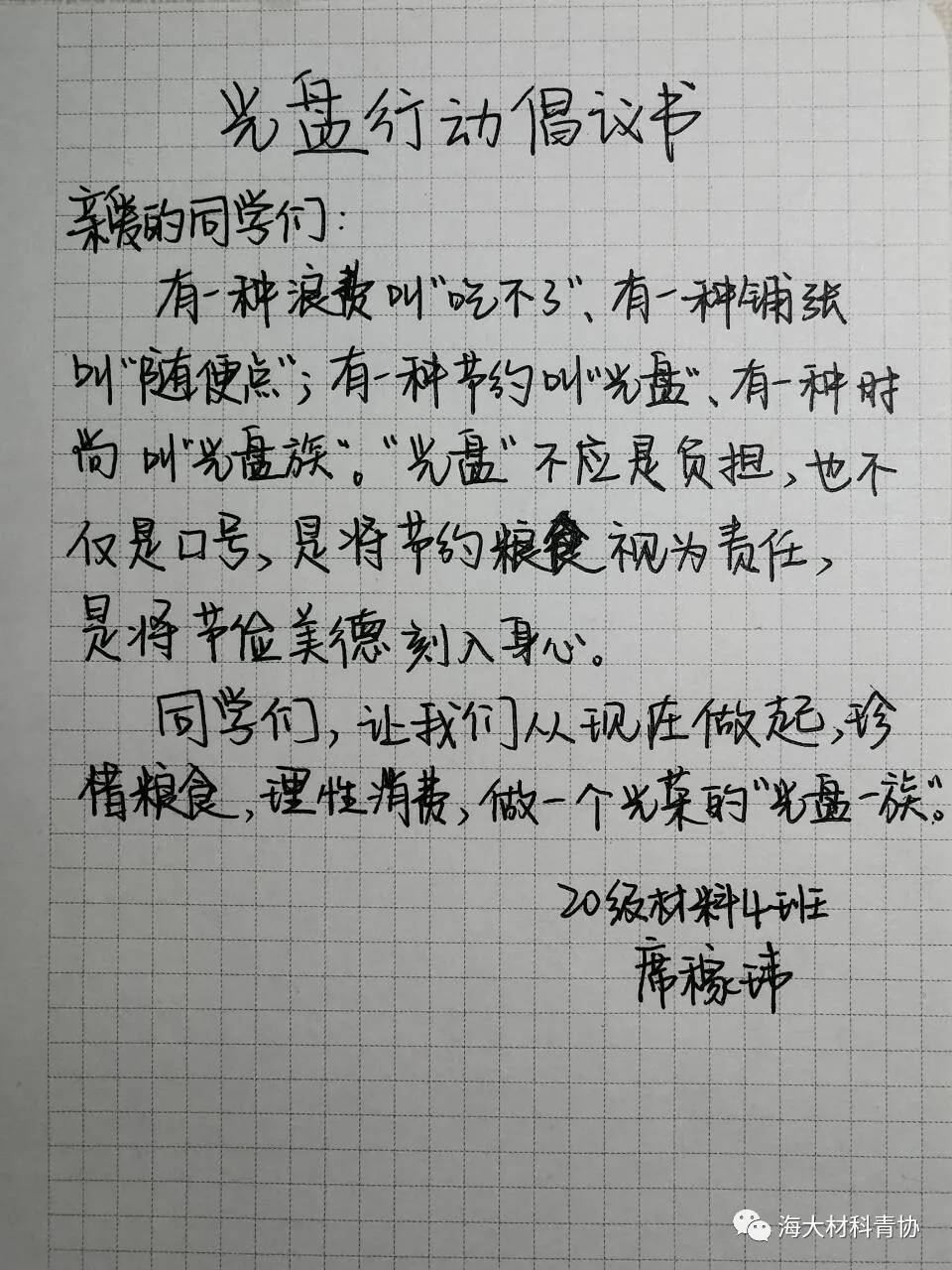 同时还举行“惜粮有你·材有未来”主题倡议书征集活动,同学们积极参加投稿,也从中也有了更深的认识。