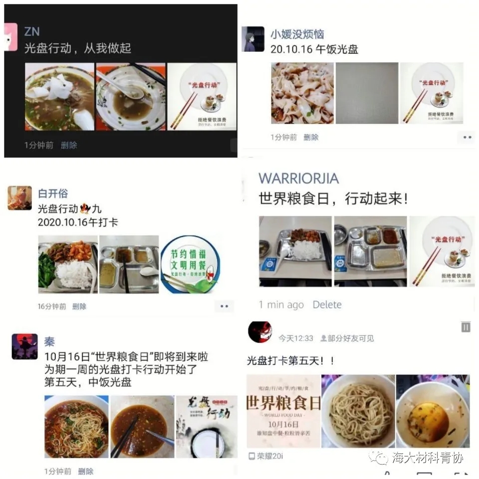 “一粥一饭,当思来之不易;半丝半缕,恒念物力维艰”2020年10月16日是第四个世界粮食日,所在周是第26个全国爱粮节粮宣传周。世界粮食日是围绕发展粮食和农业生产举行纪念活动的日子。为了大力弘扬中华民族勤俭节约的优良传统,宣传节约光荣,浪费可耻的思想,培养健康文明的餐饮文化,黑料 于10月12日至18日开展“惜粮有你·材有未来"光盘线上打卡活动。本次活动由黑料 青年志愿者协会主办。